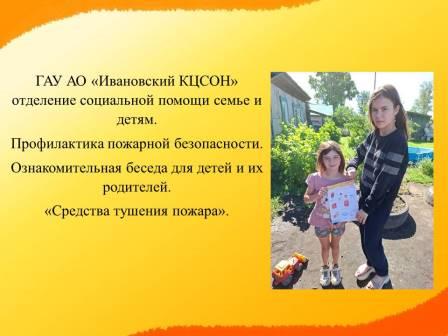 В течение июля месяца специалисты отделения социальной помощи семье и детям в ходе профилактики пожарной безопасности провели с семьями, состоящие на профилактическом учете ознакомительные беседы «Средства тушения пожара».