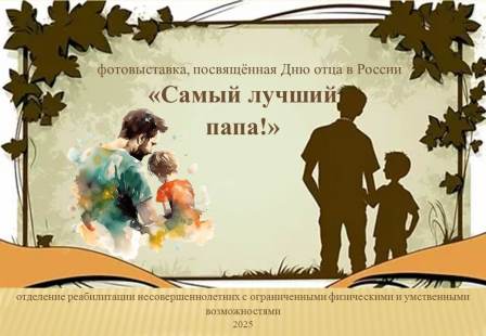 С 13.10.2025 г. по 17.10.2025 г., специалистами отделения реабилитации несовершеннолетних с ограниченными физическими и умственными возможностями была организованна и проведена фотовыставка, посвящённая Всероссийскому Дню отца «Самый лучший папа!».