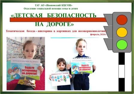 В период с 01.02.2026 г по 26.02.2026 специалист по работе с семьей отделения социальной помощи семье и детям провел с несовершеннолетними тематическую беседу- викторину в картинках «Детская безопасность на дороге».