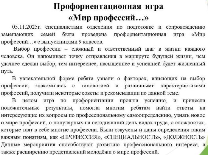 05.11.2025г. специалистами отделения по подготовке и сопровождению замещающих семей была проведена профориентационная игра «Мир профессий…» с выпускниками 9 классов. Читать далее...