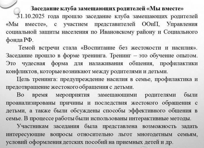 31.10.2025 года прошло заседание клуба замещающих родителей «Мы вместе», с участием представителей ООиП, Управления социальной защиты населения по Ивановскому району и Социального фонда РФ. Читать далее...