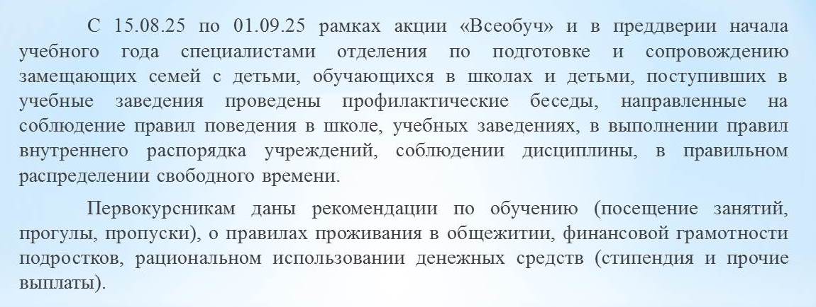 С 15.08.25 по 01.09.25 рамках акции «Всеобуч» и в преддверии начала учебного года специалистами отделения по подготовке и сопровождению замещающих семей с детьми проведена профилактическая работа с обучающимися. Читать далее...