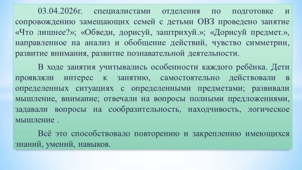 03.04.2026г. специалистами отделения по подготовке и сопровождению замещающих семей с детьми ОВЗ проведено занятие «Что лишнее?»; «Обведи, дорисуй, заштрихуй.»; «Дорисуй предмет.», направленное на анализ и обобщение действий, чувство симметрии, развитие внимания, развитие познавательной деятельности. Читать далее...