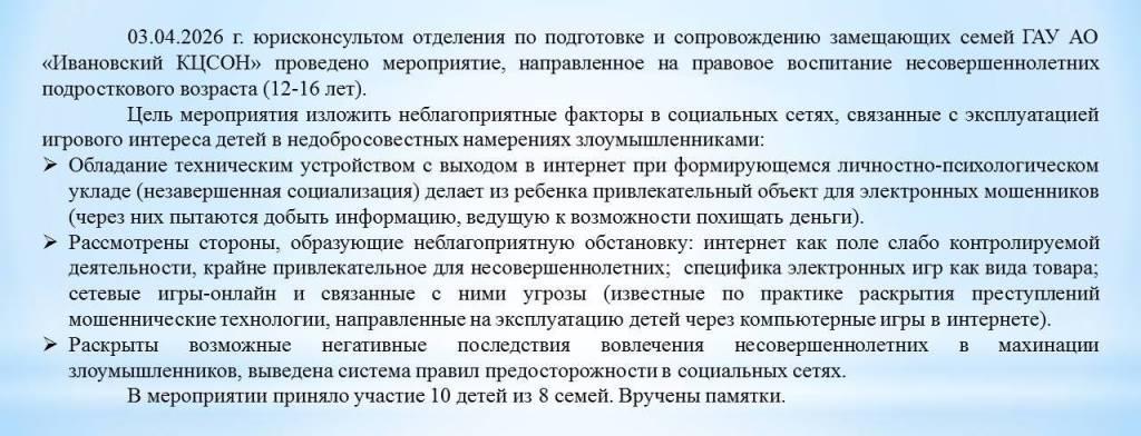 03.04.2026 г. юрисконсультом отделения по подготовке и сопровождению замещающих семей ГАУ АО «Ивановский КЦСОН» проведено мероприятие, направленное на правовое воспитание несовершеннолетних подросткового возраста (12-16 лет).Читать далее...
