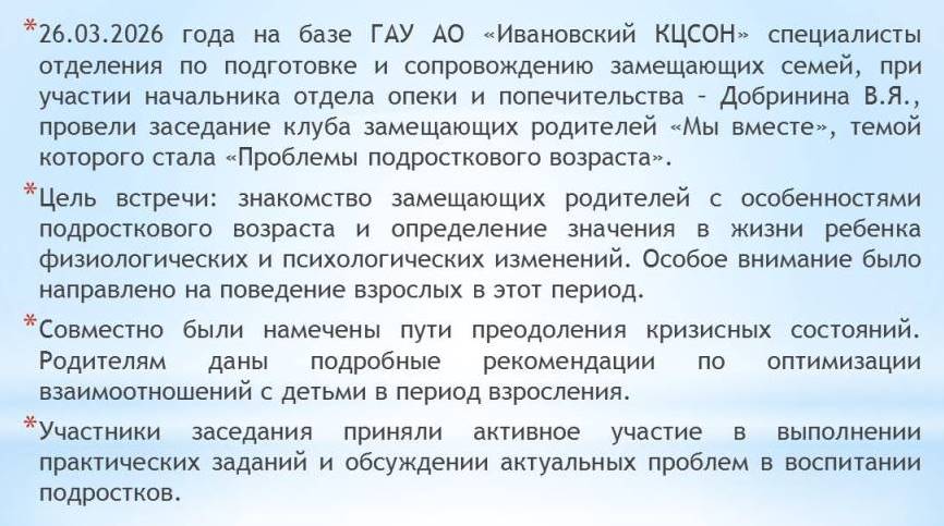 26.03.2026 года на базе ГАУ АО «Ивановский КЦСОН» специалисты отделения по подготовке и сопровождению замещающих семей, при участии начальника отдела опеки и попечительства – Добринина В.Я., провели заседание клуба замещающих родителей «Мы вместе», темой которого стала «Проблемы подросткового возраста». Читать далее...